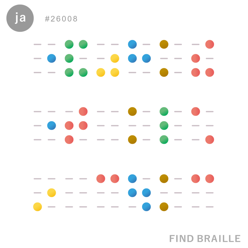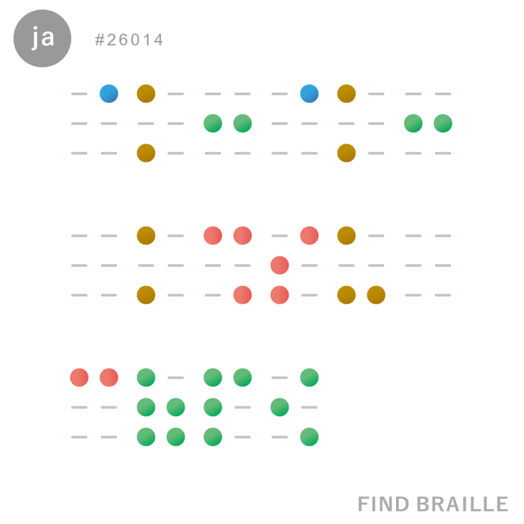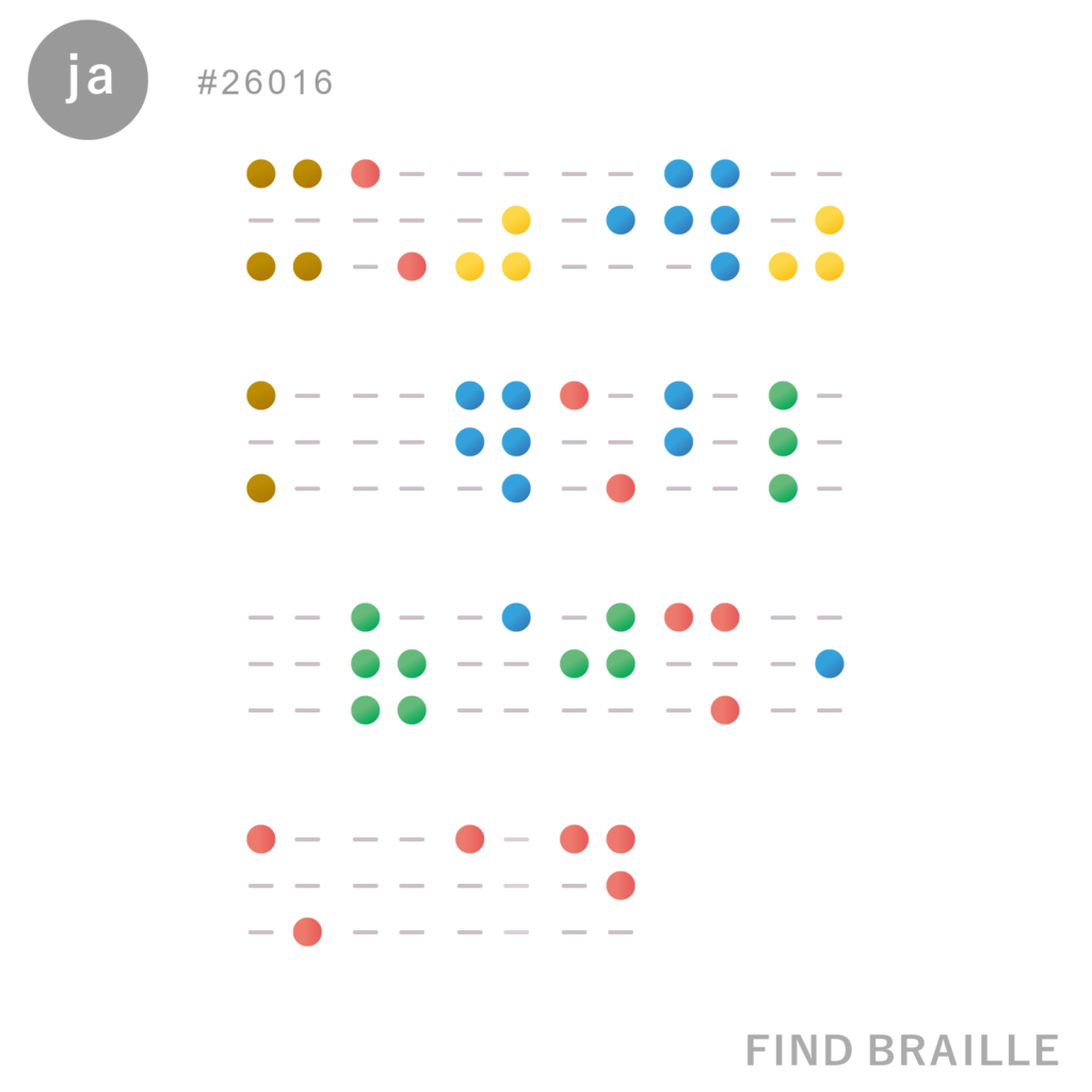 点字は単語の途中では改行しないものですが、ここに表示されるものの中には画像におさめるために単語の途中で改行しているものも含まれます。